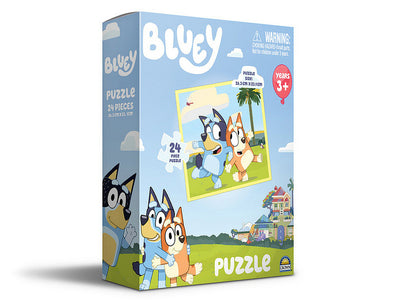 A 24 piece jigsaw puzzle 26cm x 23cm, showing a scene from the popular children's TV series, Bluey.