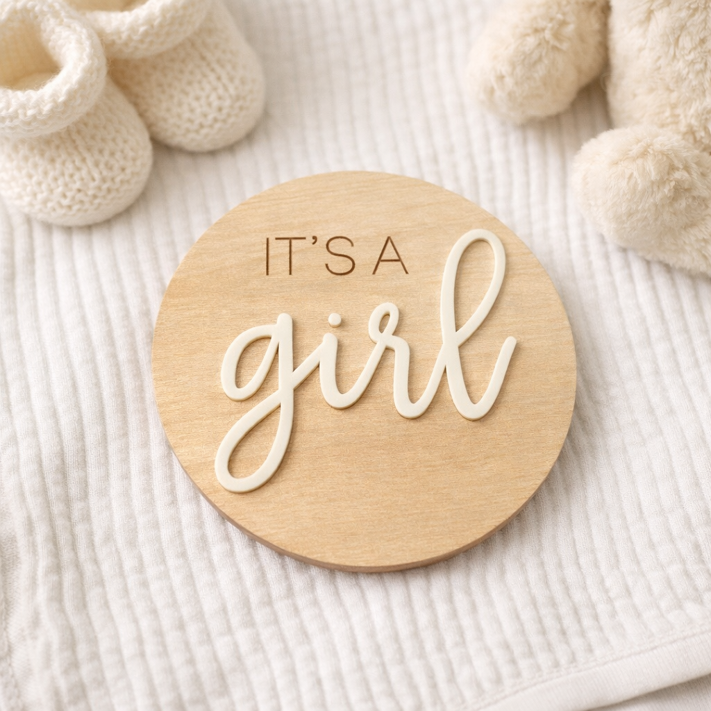 Mark the sweetest moment with this timeless “It’s a Girl” timber milestone card – perfect for birth announcements, newborn photos, or nursery styling. Crafted from natural timber with a soft, raised script finish, this keepsake adds a warm, minimal touch to your baby’s first memories.