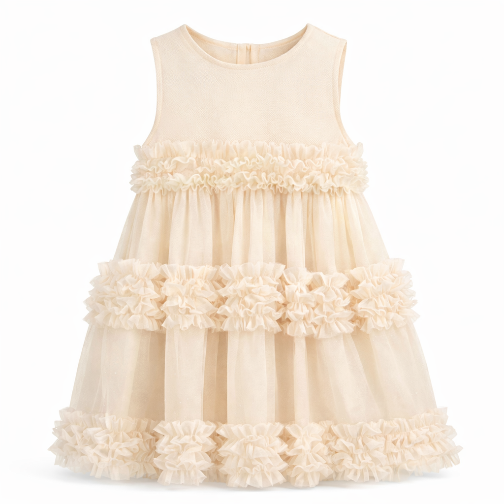 A beautiful layered tulle dress with soft ruffle tiers for extra volume and twirl. Designed with a smooth bodice and lightweight, floaty skirt, it’s comfy to wear while still feeling extra special. Available in sweet pink or soft cream—perfect for birthdays, parties, flower girls, and special occasions.