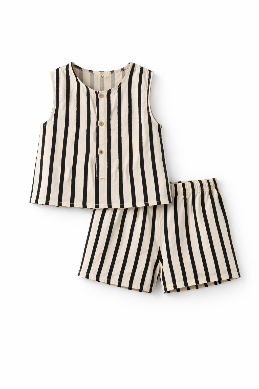 Featuring a relaxed sleeveless tank top paired with matching elastic-waist shorts, this set is made for busy little bodies that love to explore, climb, run and play. The bold black stripe on soft natural fabric gives a modern, coastal feel that looks effortlessly stylish while remaining practical for daily wear.