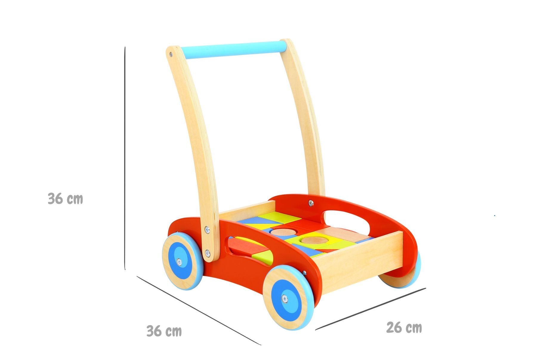 Introducing the Wooden Baby Walker with Blocks from Tooky Toy, a versatile and engaging toy designed to support your child's developmental milestones with endless hours of fun and learning This baby walker with blocks offers multifaceted benefits for young children as they embark on their journey towards independent mobility. By grasping the sturdy handlebars, little ones can practice and strengthen their walking skills while gently pushing the walker forward, promoting muscle development and enhancing balance and coordination. But the excitement doesn't end there When it's time for a break from walking, the colourful blocks nestled within the base of the walker provide ample opportunities for imaginative play and cognitive development. Children can stack the blocks to build towering structures, sort them by colour for a stimulating matching activity, or return them to the tray as a simple puzzle. With 22 assorted blocks in primary colours and various shapes, this set offers endless possibilities for creative exploration and problem solving. Crafted from solid timber and finished to the highest quality, each wooden baby walker with blocks from Tooky Toy is built to withstand the rigors of active play, ensuring years of enjoyment for growing toddlers. Measuring approximately 26cm wide x 36cm long and 36cm high, with square blocks measuring approximately 4.8cm, this walker is perfectly sized for little hands and growing legs. Plus, with child safe, non toxic paint, parents can have peace of mind knowing their child is playing with a safe and durable toy. Encourage your child's physical and cognitive development while sparking their imagination with the Wooden Baby Walker with Blocks from Tooky Toy. It's the perfect companion for every step of their early learning journey