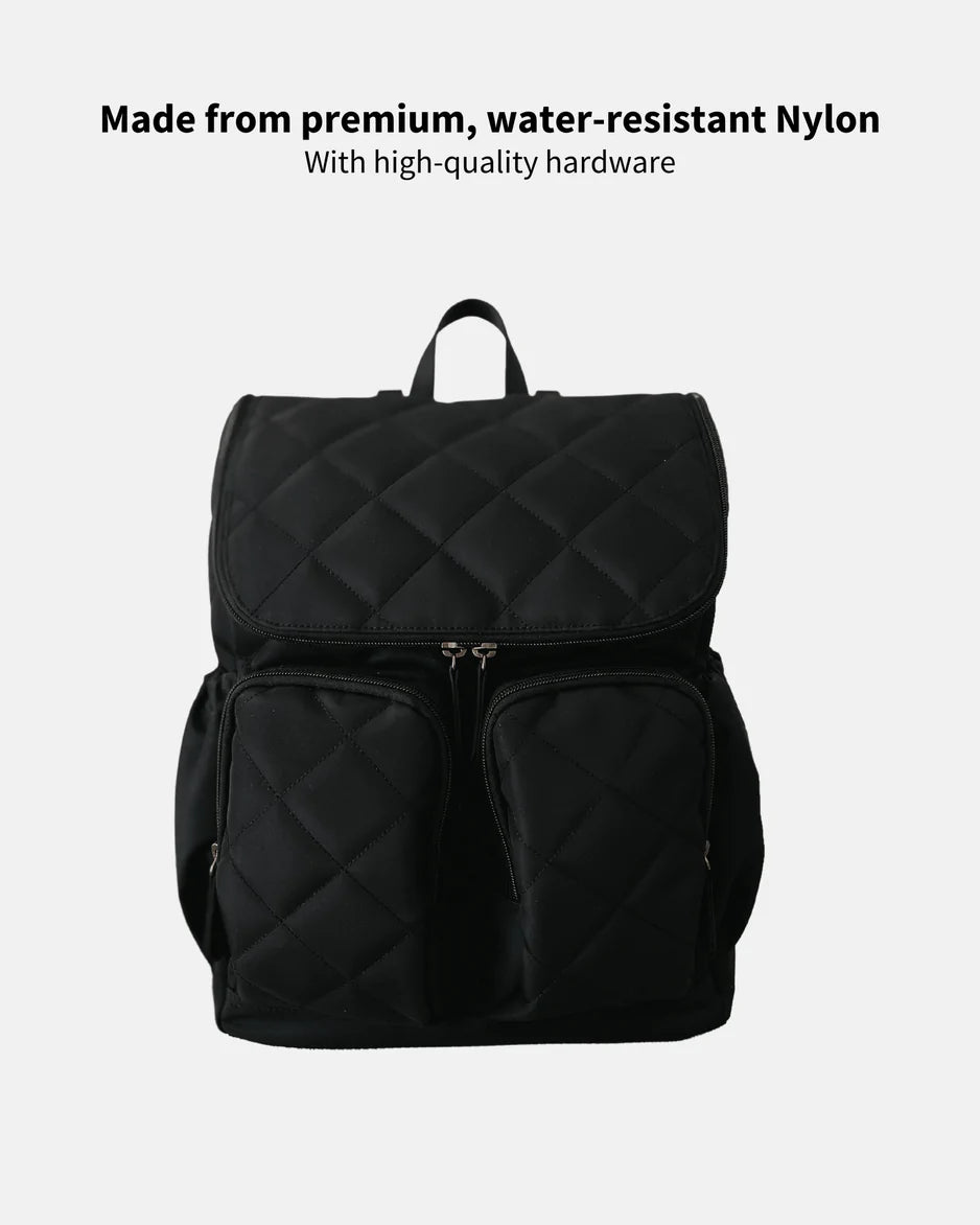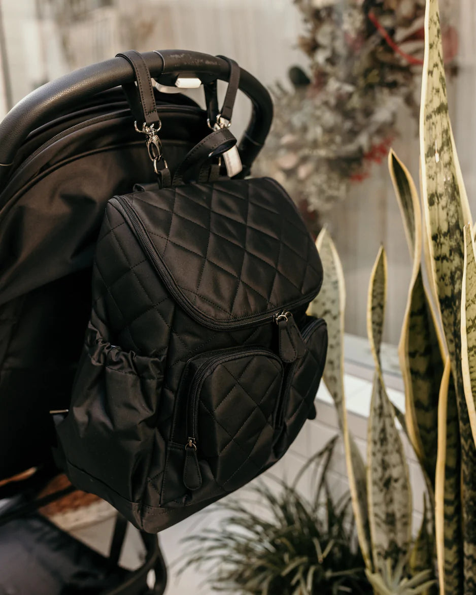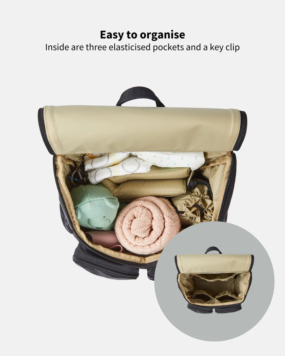 The Multitasker Nappy Backpack by OiOi has been designed with families of multiple kids in mind. It is the largest nappy bag in our collection and it has two main compartments for easy organisation. With its large capacity and luggage strap, it is also perfect for travelling. Measures: H43cm x W30cm x D17cm Made from Premium Faux Leather; Lining: 100% Water-Resistant Nylon Easy to wipe clean inside & out Front compartment: two elasticised pockets & key clip Back compartment: zip pocket & one large elasticised pocket (padded for laptop or iPad storage) 2 external insulated pockets for bottles 1 front pocket Luggage sleeve Protective metal feet at the bottom of the bag Thick, padded and adjustable shoulder straps 30 litre capacity; fits a 17” laptop Comes with large padded wipeable change mat, insulated bottle holder, clear zip purse and two stroller straps Please refer to white-background studio shots for true colour.