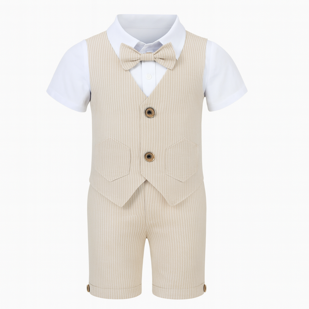 Dress your mini man to impress with the Albie Formal Set — a timeless three-piece outfit perfect for weddings, family photos, and special celebrations. This beautifully tailored ensemble includes a crisp white short-sleeve shirt, a beige pinstripe vest, and coordinating shorts, all designed with attention to detail and comfort in mind.