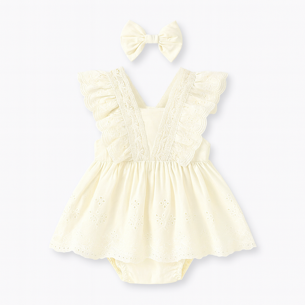 The V-shaped lace bodice flows into a softly gathered skirt overlay, creating the look of a dress with the practicality of a romper underneath. Complete with a matching bow headband, it’s the perfect outfit for birthdays, family photos, or special occasions.